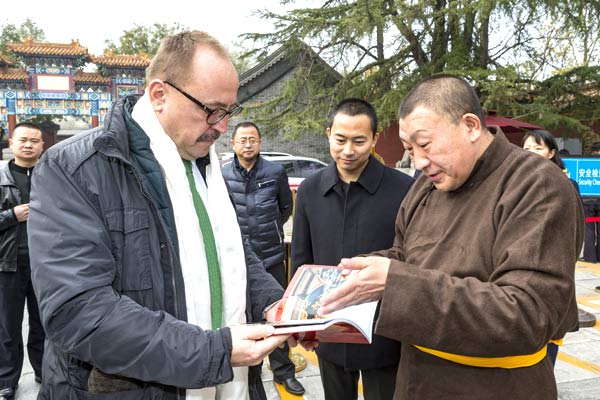 雍和宫管家马志德向匈牙利国会外事委员会主席内梅特·若尔特先生敬献哈达赠送画册