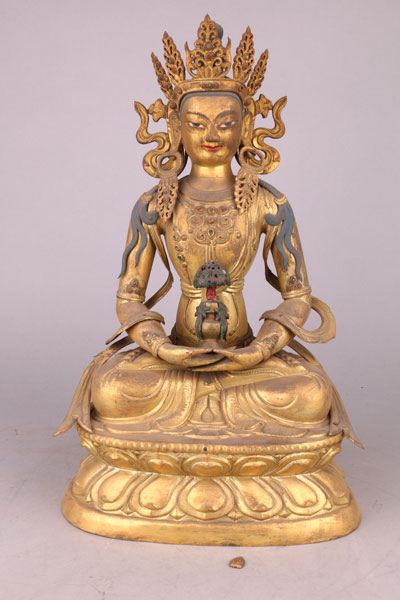 无量寿佛又有清净光佛、智慧光佛多个汉译名称,也被称为“长寿佛”,是阿弥陀佛的又一身相。阿弥陀佛是西方极乐世界的教主,被尊为五方佛之一。此尊无量寿佛面部宽方,五官端正,双目凝视,双手结印捧宝瓶,莲台宽大,莲瓣肥厚。绕臂的帛带分饰两肩。整尊佛像面部泥金,更显出古朴庄肃的意韵。