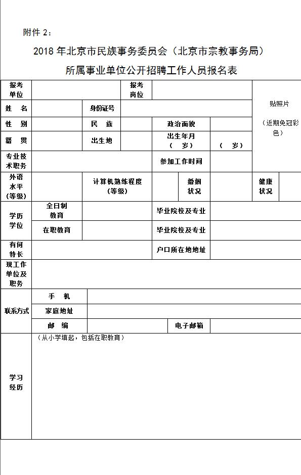 2018年北京市民族事务委员会(北京市宗教事务局)所属事业单位公开招聘工作人员报名表